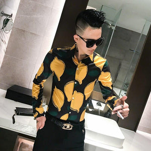 Lemon Pattern Men Shirts Long Sleeve Yellow Mens Shirts Casual Slim Fit Social Mens Dress Shirts Night Club Outfits Erkek Gomlek $67.95 $134.95