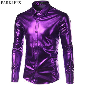 Purple Coated Metallic Night Club Wear Shirt Men Long Sleeve Halloween Button Down Mens Dress Shirt Shiny Elastic Chemise Homme from $51.95 $107.95