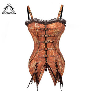 TOPMELON Retro Bustier Steampunk Tan Corset Women Gothic Corsets and Bustiers with Strap Corselet Buckle Gears Pattern Long Tops $69.10
