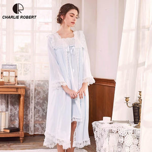 Autumn Cotton Women Embroidered Rob Sets White 2 Pieces Lace Nightgowns Long Sleeve Retro Solid Color Sleepwear Home Wear 063 $99.95 $198.95